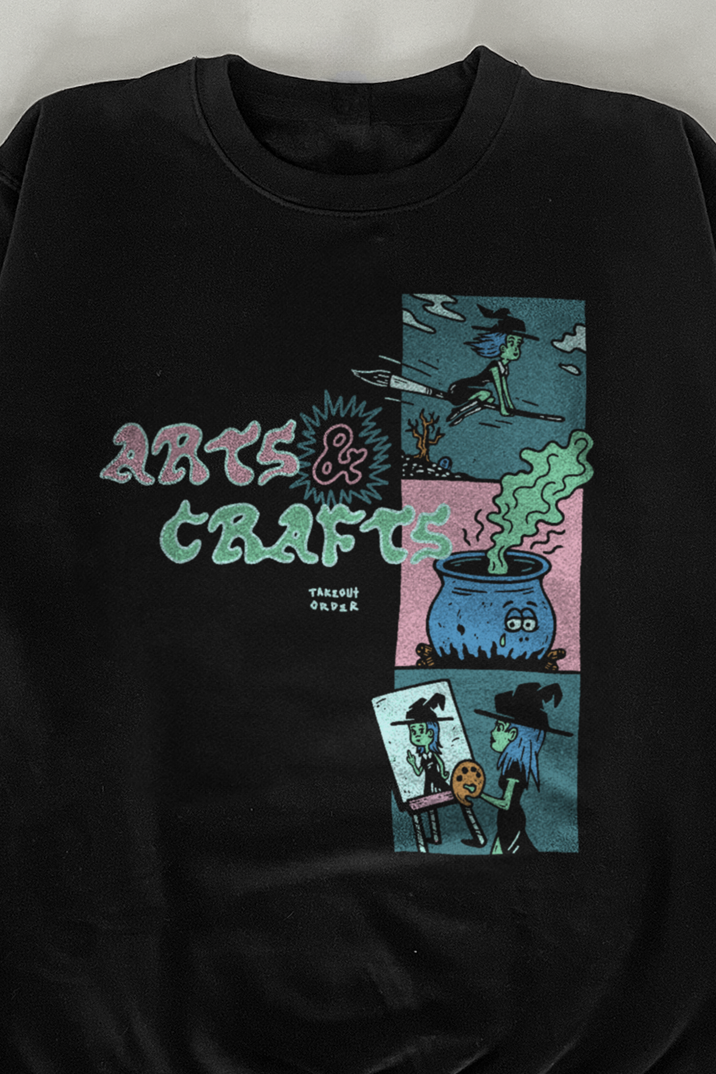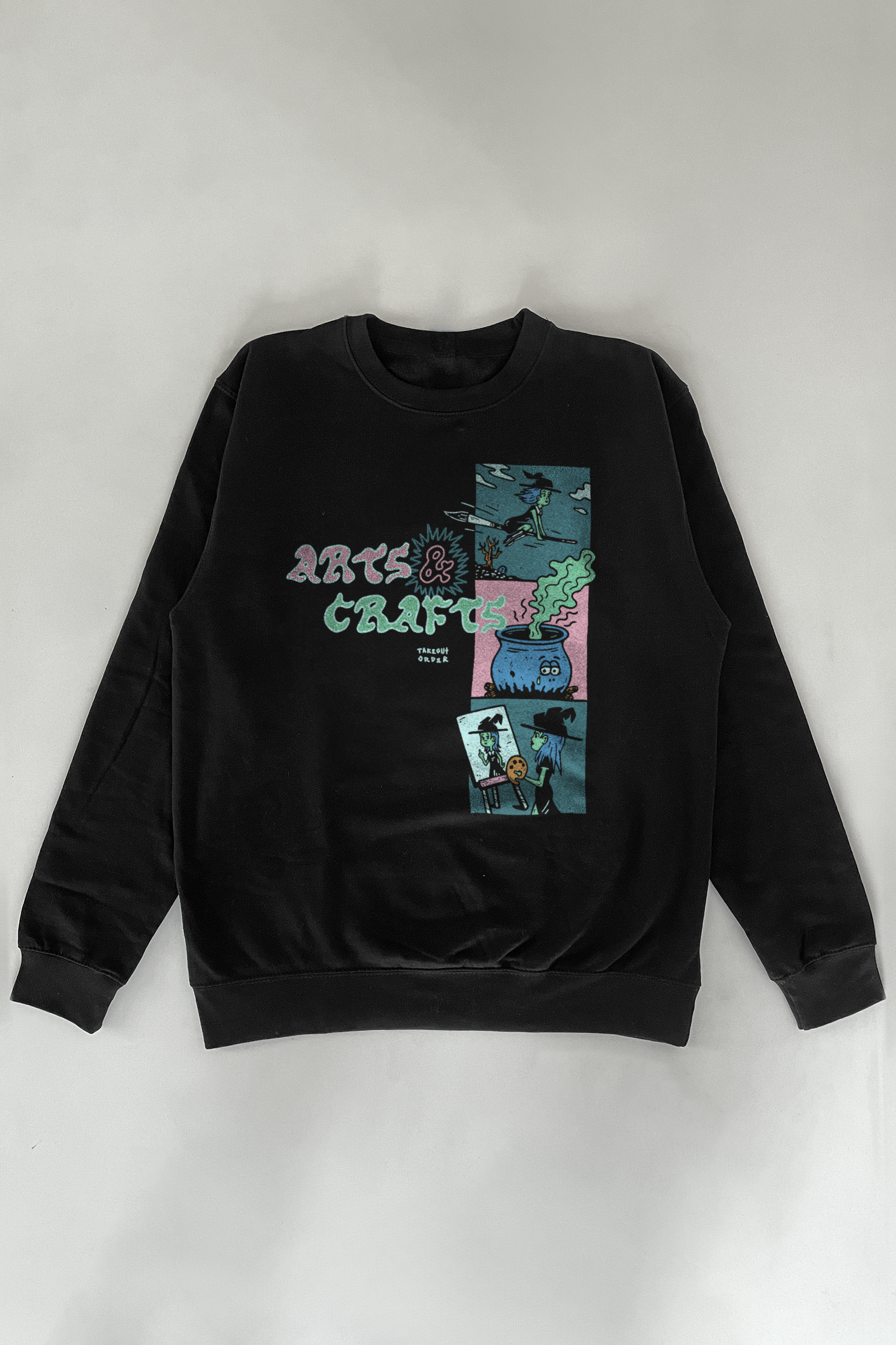 A mid-weight unisex pullover crewneck sweatshirt featuring an oversized print of a 'Witch and Cauldron.' Fit runs on the smaller side, size up for oversized look.