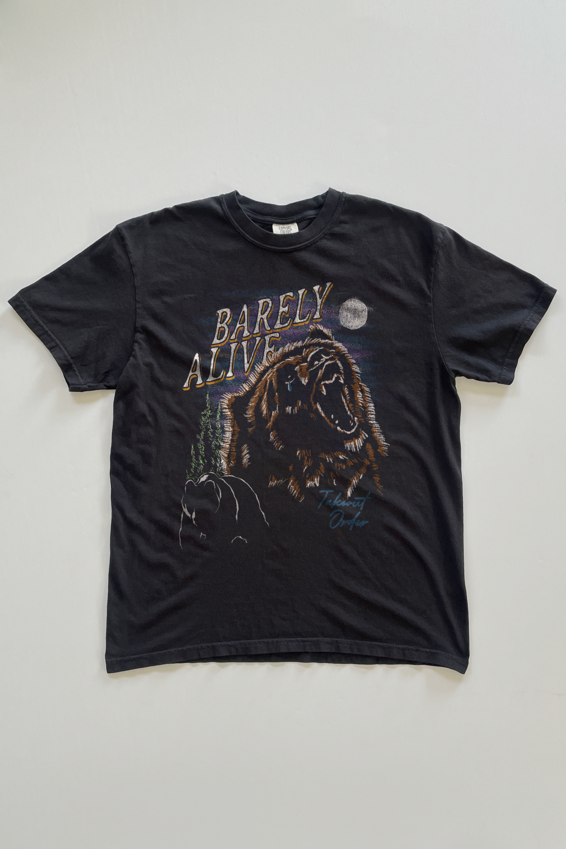 Forget about your worries and your strife. Garment dyed, seamless body crew neck featuring a 'Bear' graphic printed direct to film on the front. Unisex sizing, so a looser women's fit.