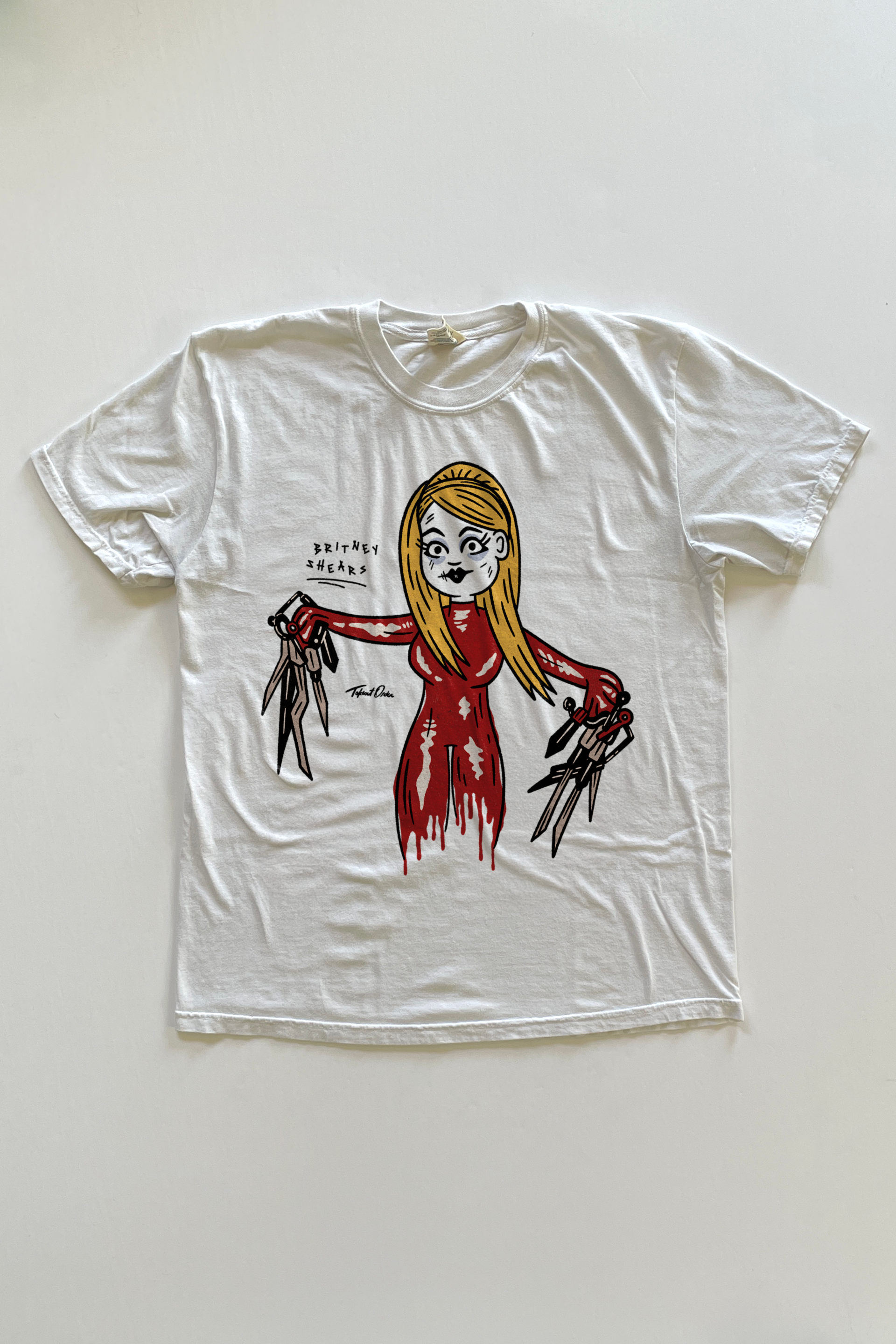 Clip me baby, one more time. Garment dyed, seamless body crew neck featuring a 'Scissor-handed Brit' graphic printed direct to film on the front. Unisex sizing, so a looser women's fit.