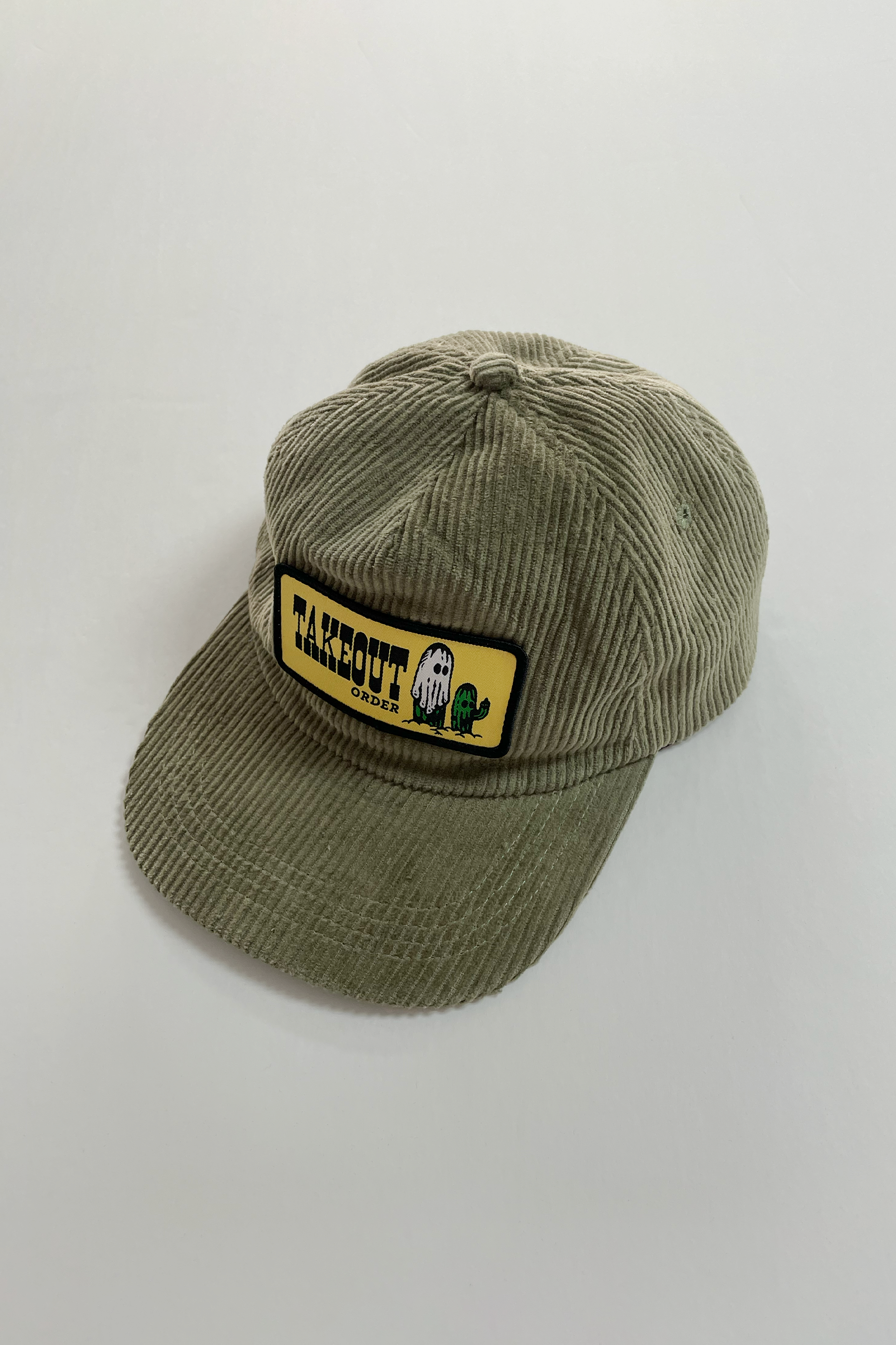 Green 5 panel with an unstructured crown. The hat, made of soft, corduroy fabric, features a fabric strap with brass metal clasp and a "Cactus Homies" patch.