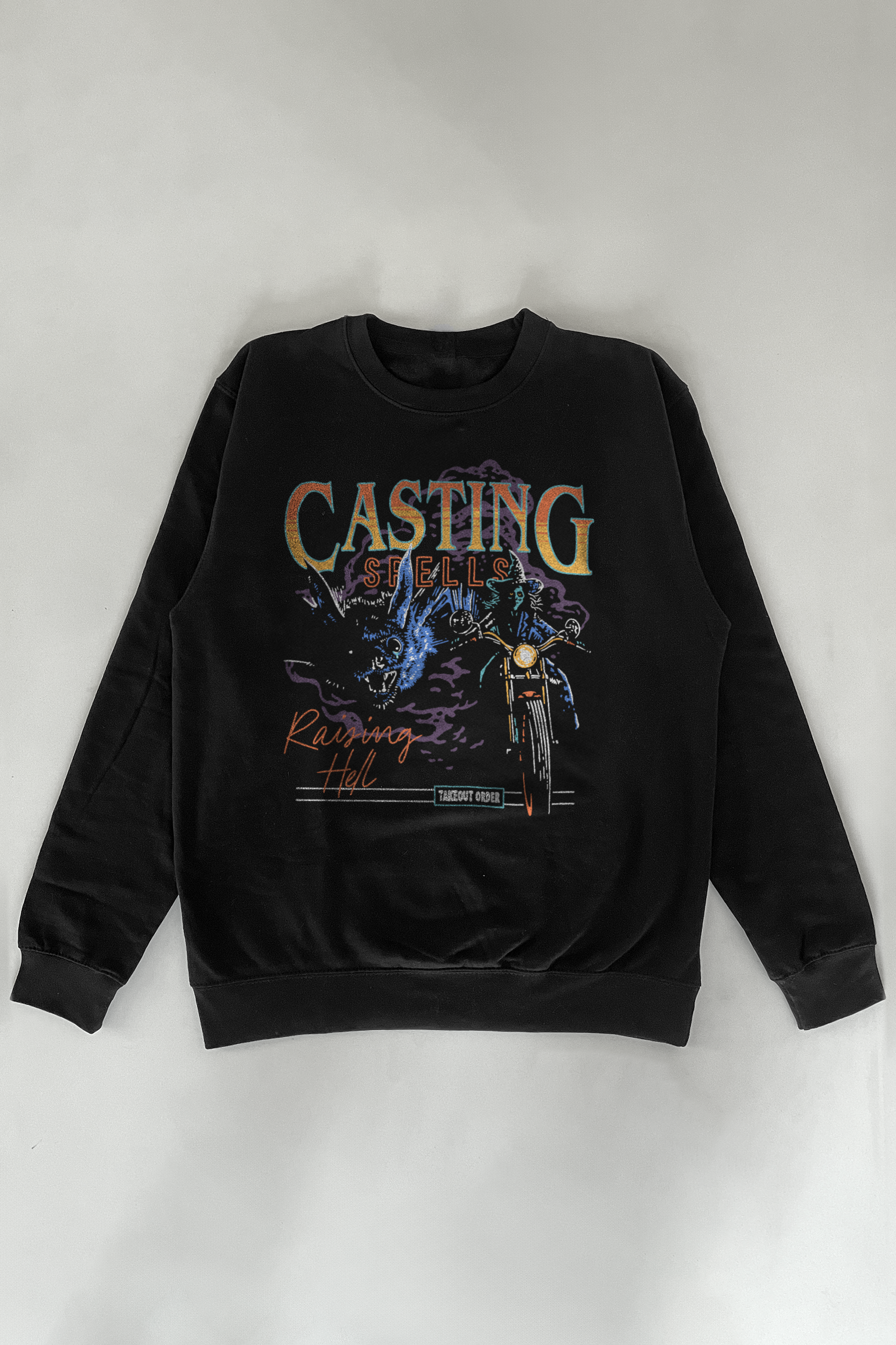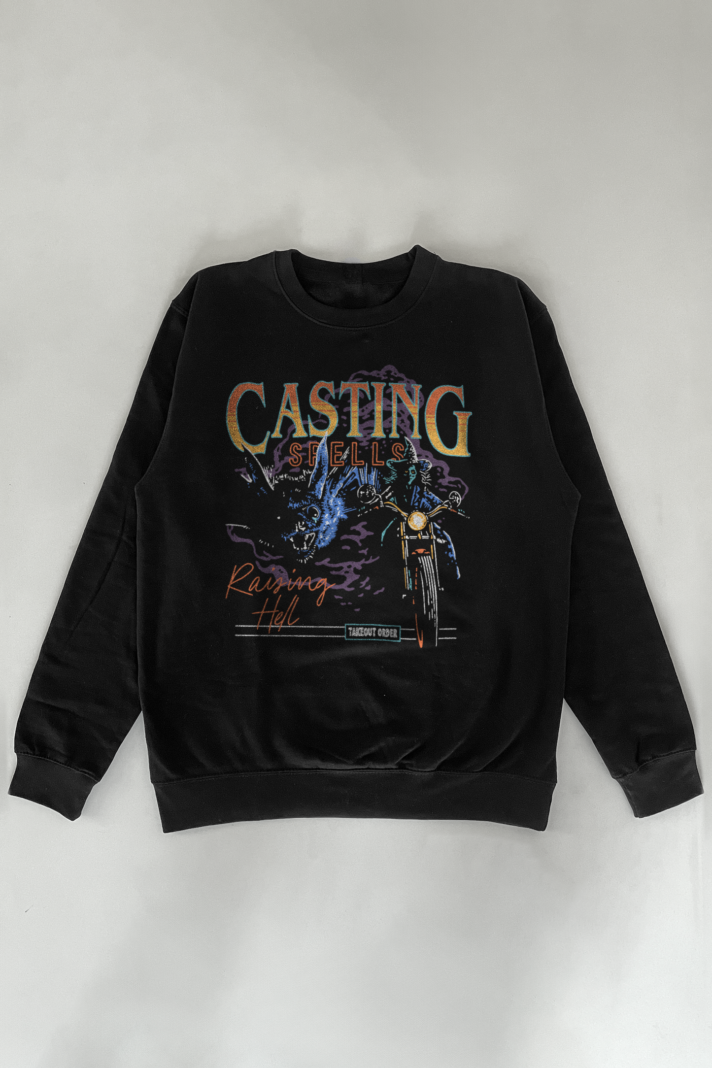 A mid-weight unisex pullover crewneck sweatshirt featuring an oversized print of a 'Witch and Bat.' Fit runs on the smaller side, size up for oversized look.