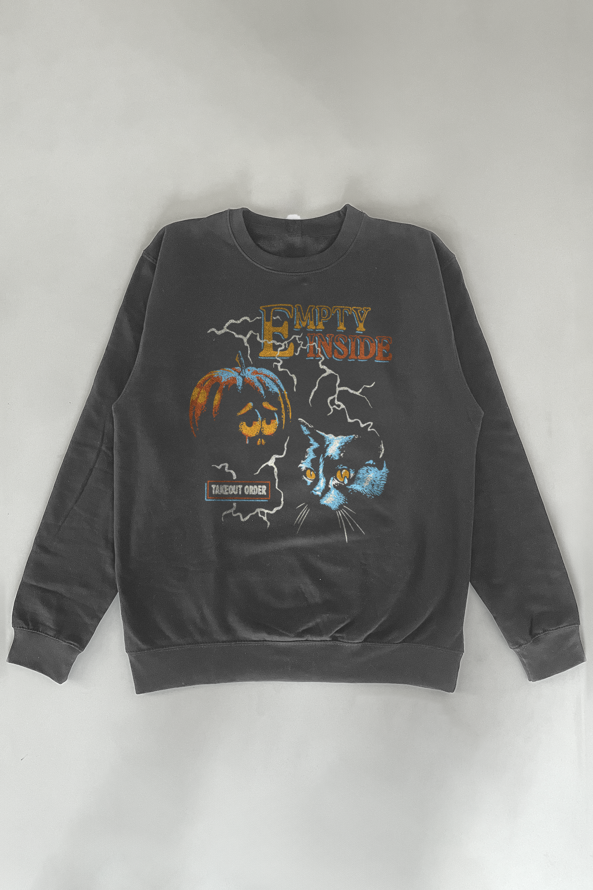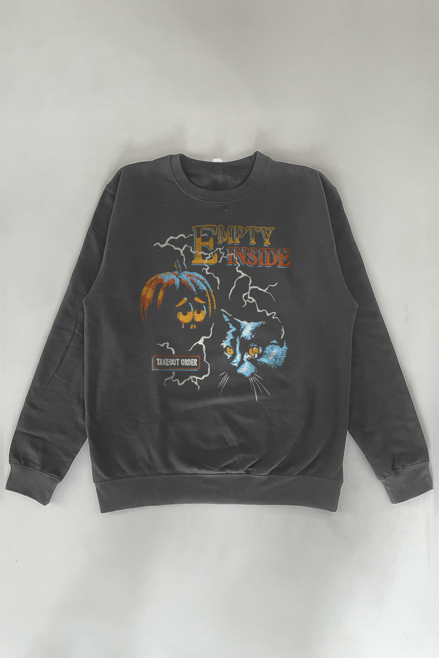 A mid-weight unisex pullover crewneck sweatshirt featuring an oversized print of a 'Pumpkin and Cat.' Fit runs on the smaller side, size up for oversized look.