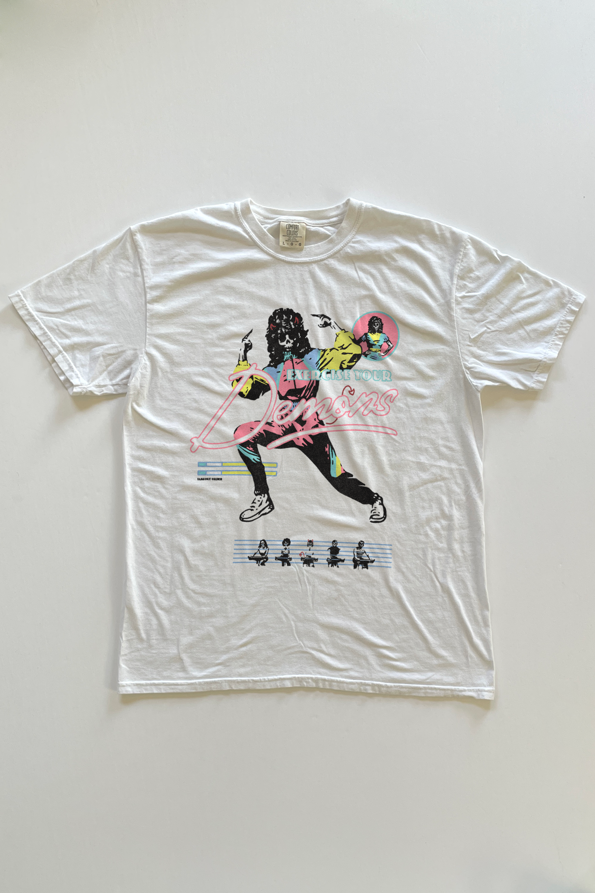 Hot girl summoning. Garment dyed, seamless body crew neck featuring a 'Demon' graphic printed direct to film on the front. Unisex sizing, so a looser women's fit.