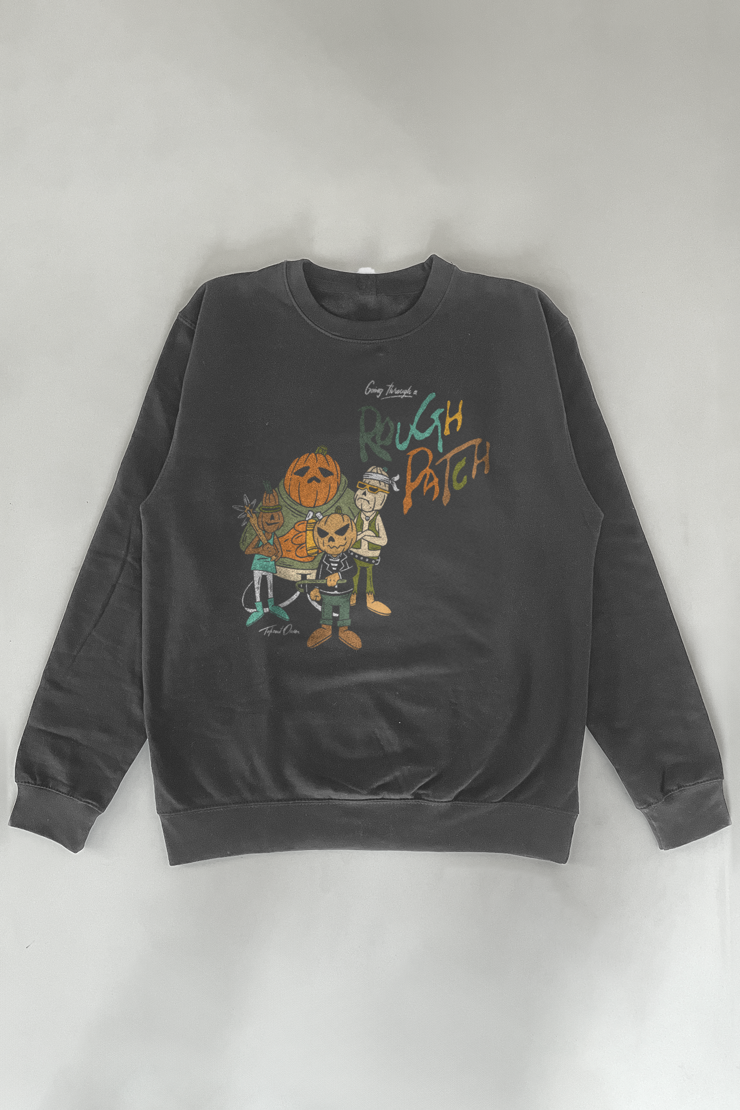 A mid-weight unisex pullover crewneck sweatshirt featuring an oversized print of a 'Pumpkin Gang.' Fit runs on the smaller side, size up for oversized look.