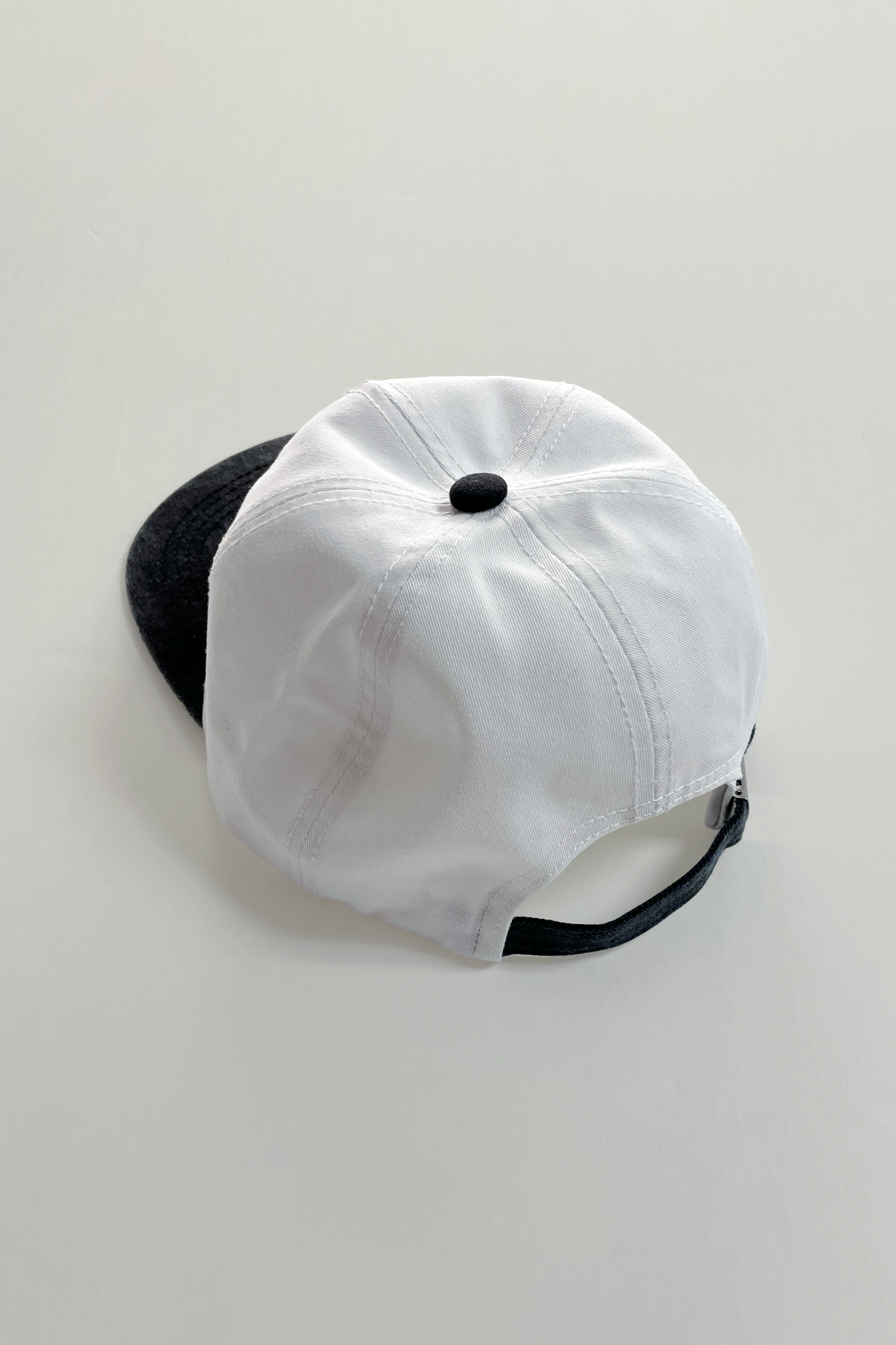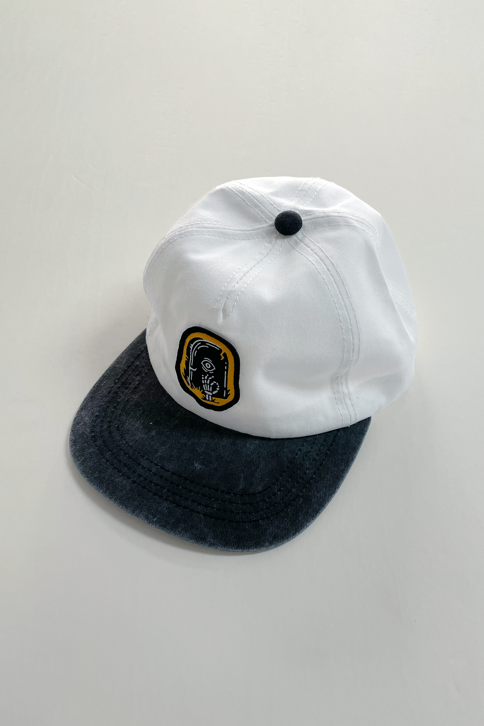 Two-tone 5 panel with an unstructured crown. The hat, made of brushed cotton twill fabric, features a fabric strap with silver metal clasp and a "Gravestone" patch.