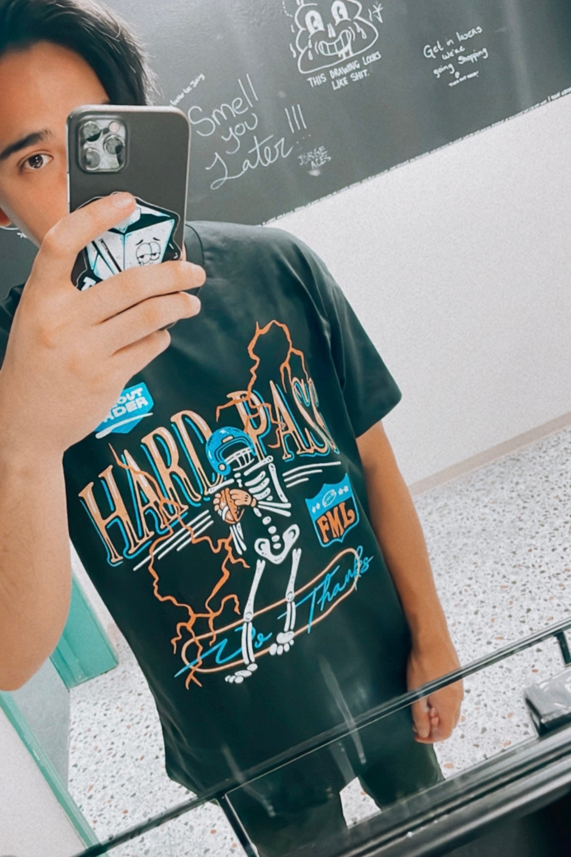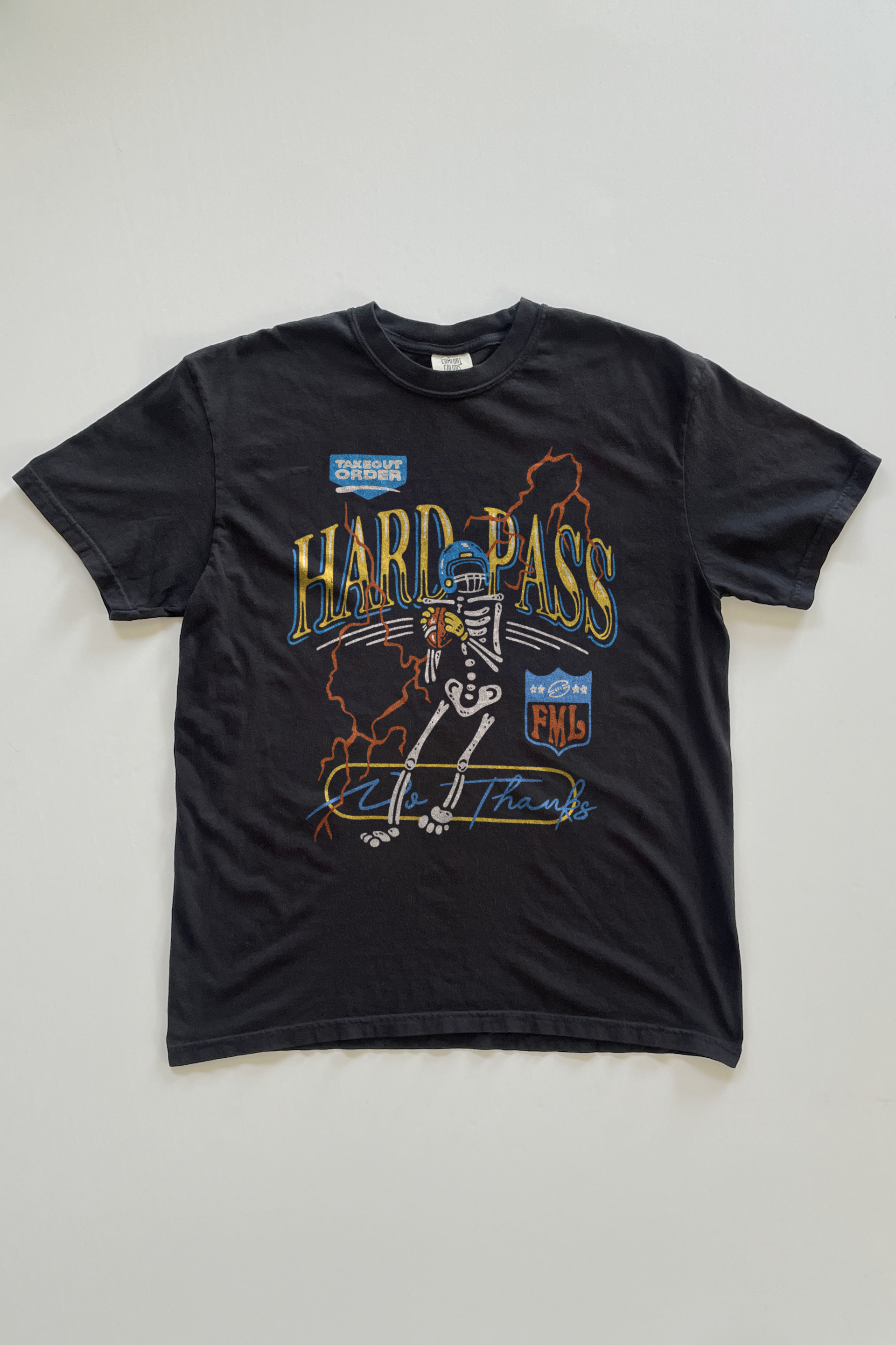 No Thanks! Garment dyed, seamless body crew neck featuring a 'Quarterback' graphic printed direct to film on the front. Unisex sizing, so a looser women's fit.