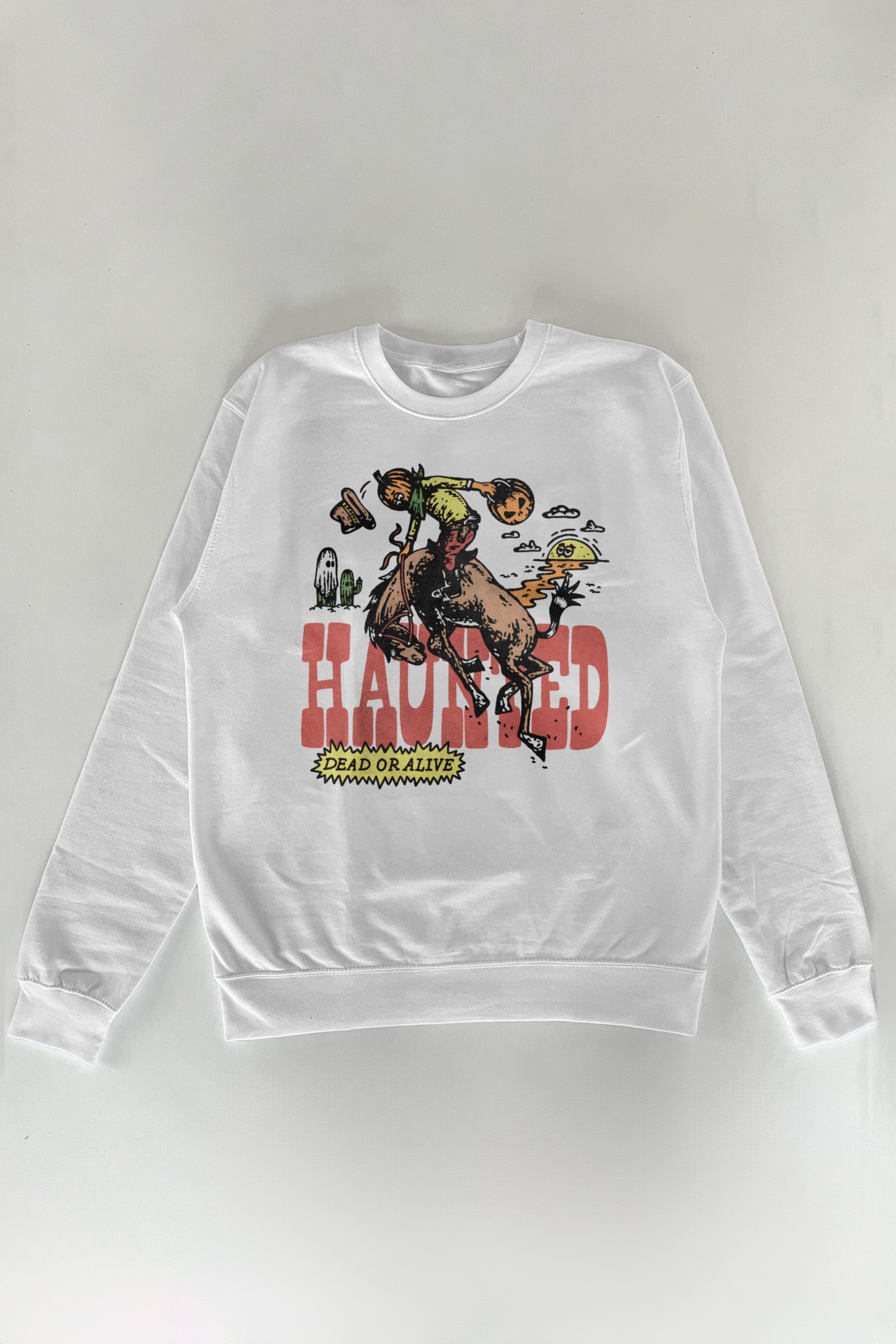 A mid-weight unisex pullover crewneck sweatshirt featuring an oversized print of a 'Cowboy Pumpkin.' Fit runs on the smaller side, size up for oversized look.