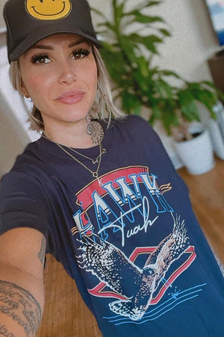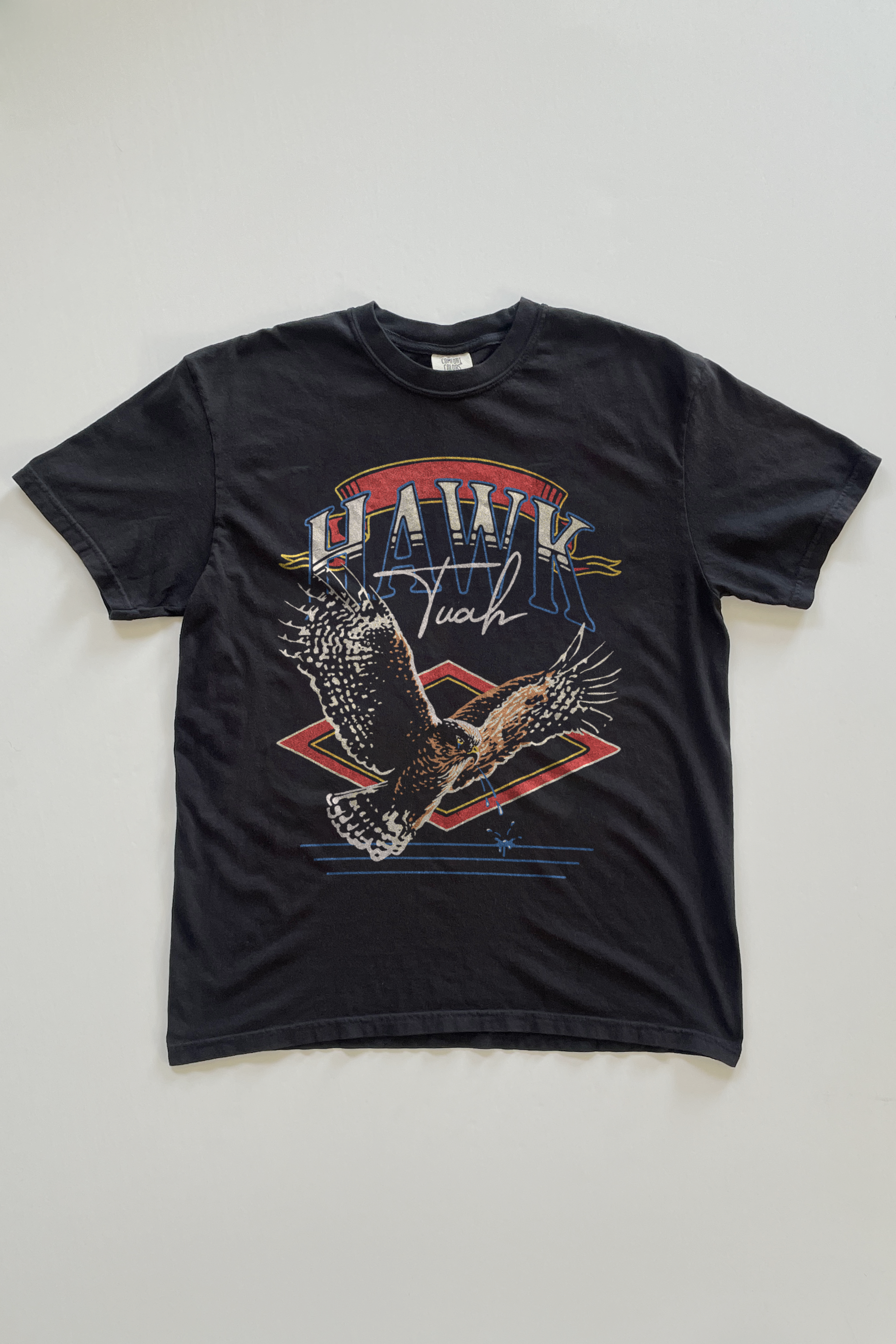 Spit on that thang! Garment dyed, seamless body crew neck featuring a 'Hawk' graphic printed direct to film on the front. Unisex sizing, so a looser women's fit.