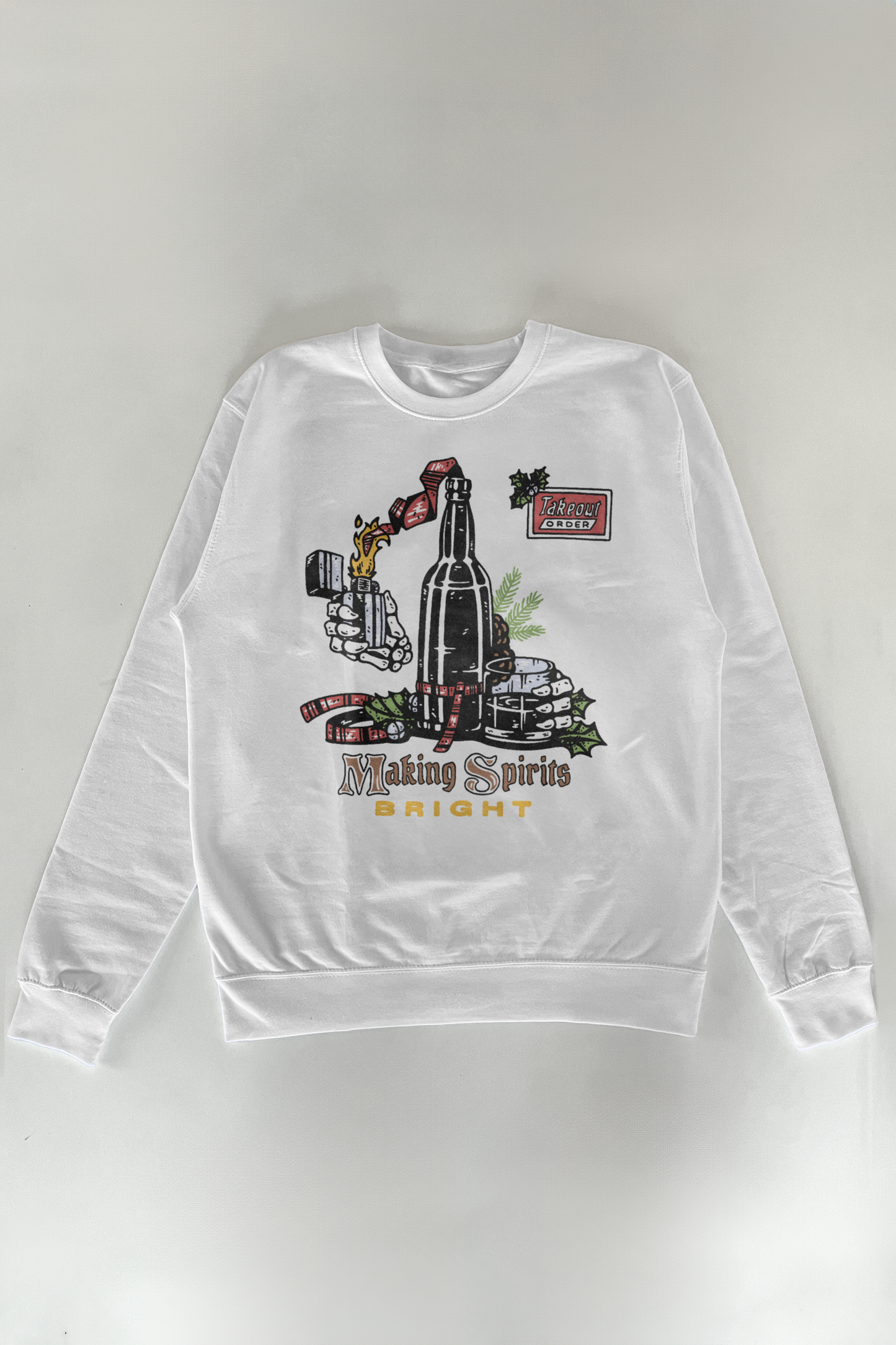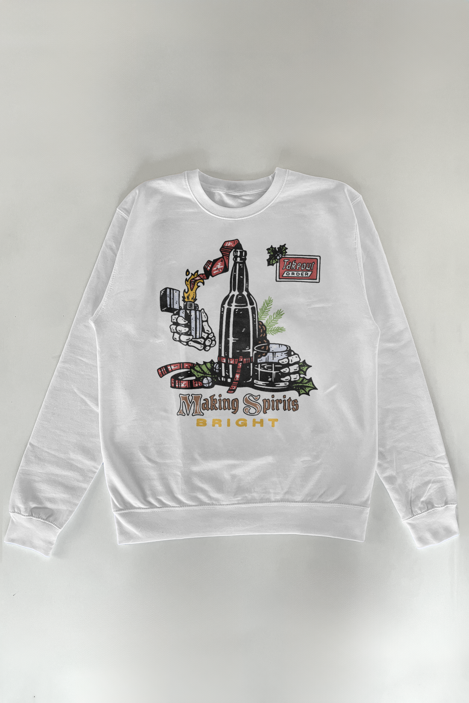A mid-weight unisex pullover crewneck sweatshirt featuring an oversized print of a 'Spirit Bottle.' Fit runs on the smaller side, size up for oversized look.