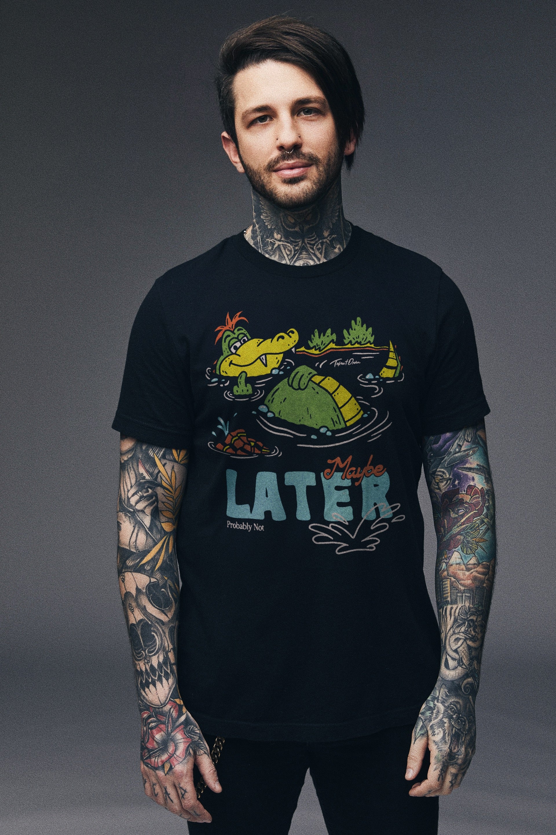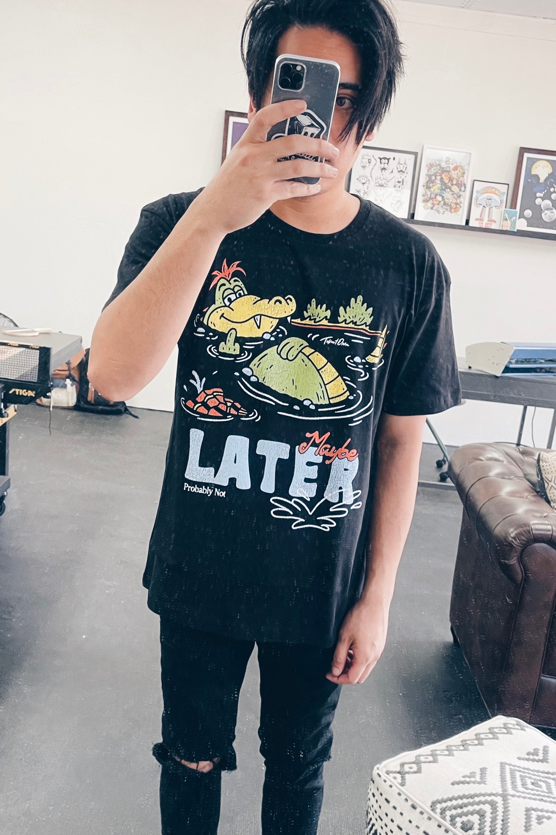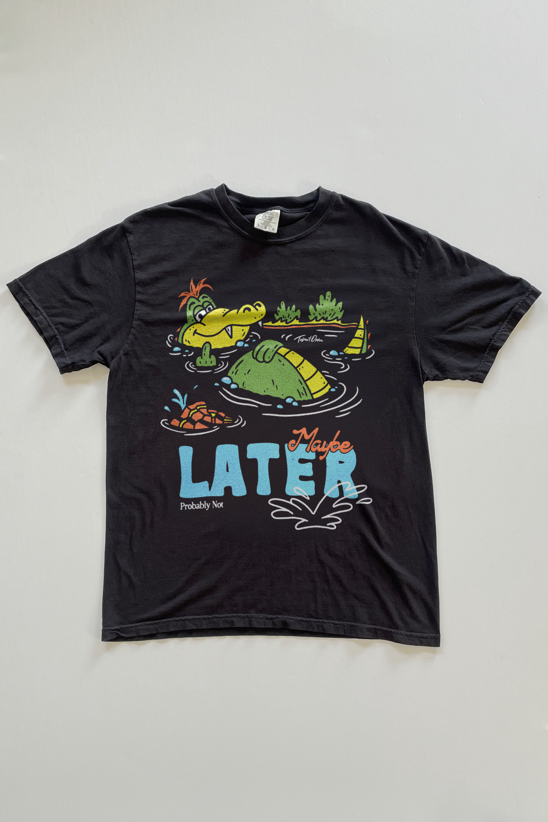 Ask me again tomorrow. Garment dyed, seamless body crew neck featuring an 'Alligator' graphic printed direct to film on the front. Unisex sizing, so a looser women's fit.