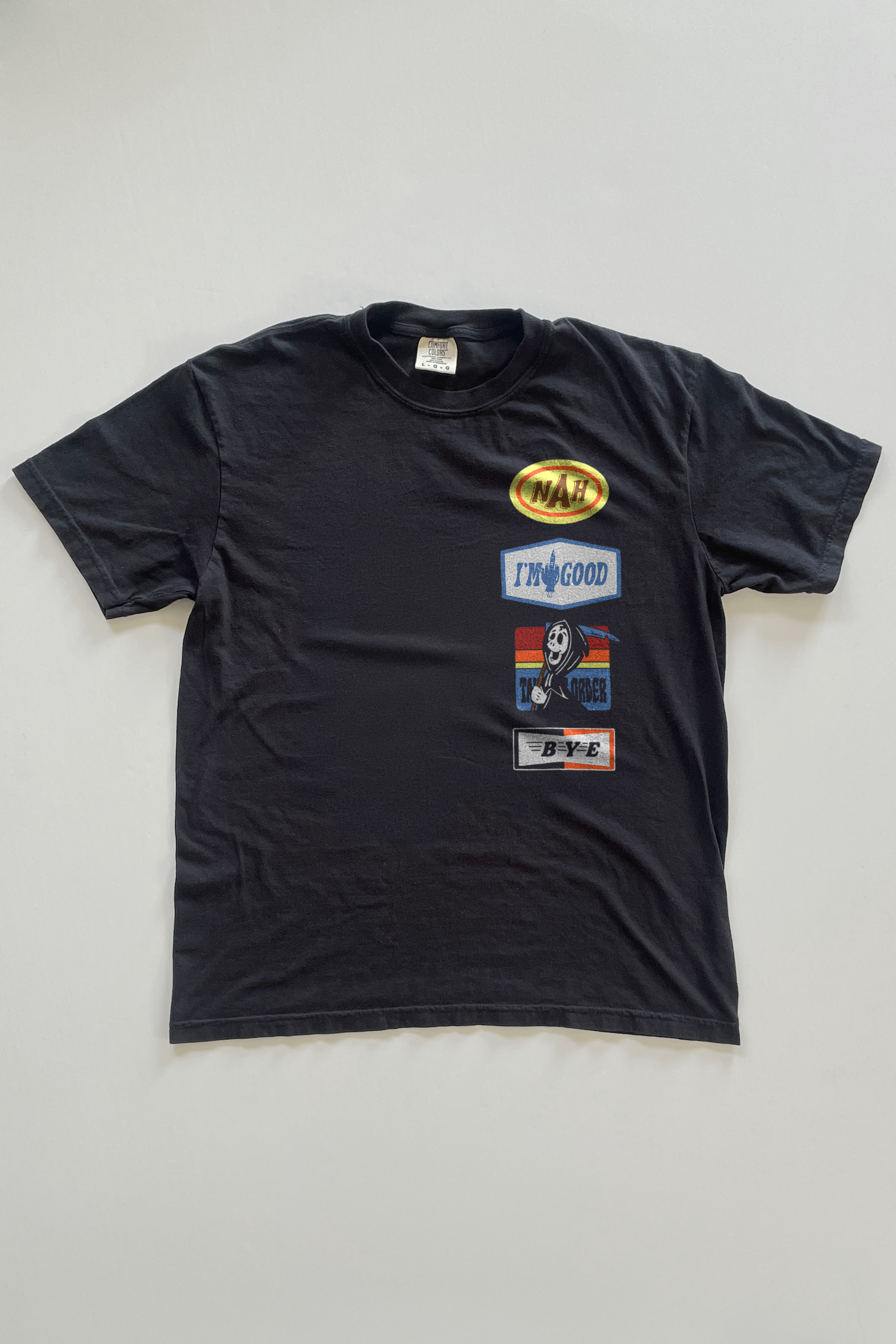 Byeee. Garment dyed, seamless body crew neck featuring a few 'Patch' graphics printed direct to film on the front. Unisex sizing, so a looser women's fit. *Not actual patches.