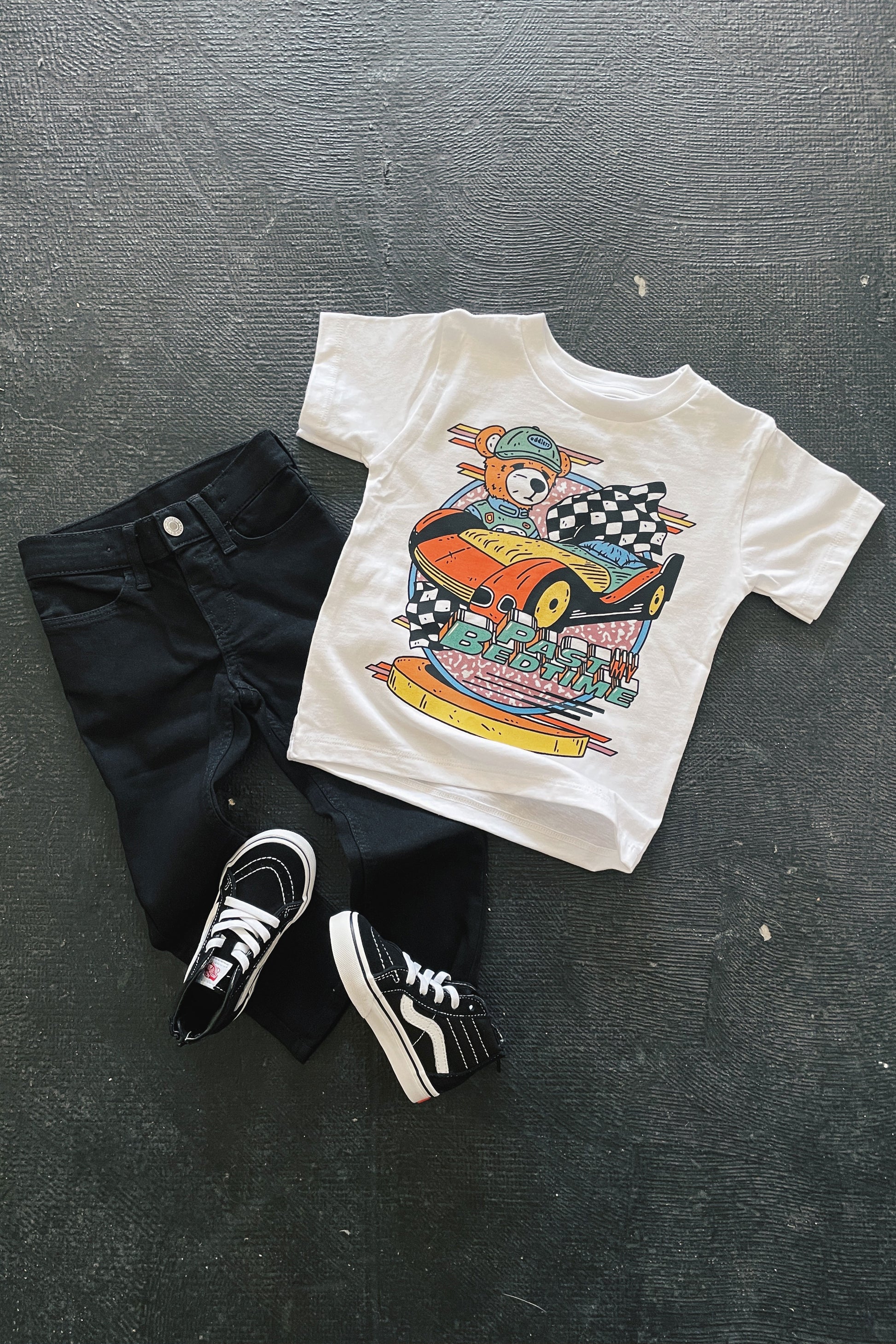 Racing to sleep. Our toddler t-shirt is just like your favorite that you love to wear - comfy and fits well. It has a round neck and short sleeves, carefully crafted from superior Airlume combed and ring-spun cotton for ultimate softness.