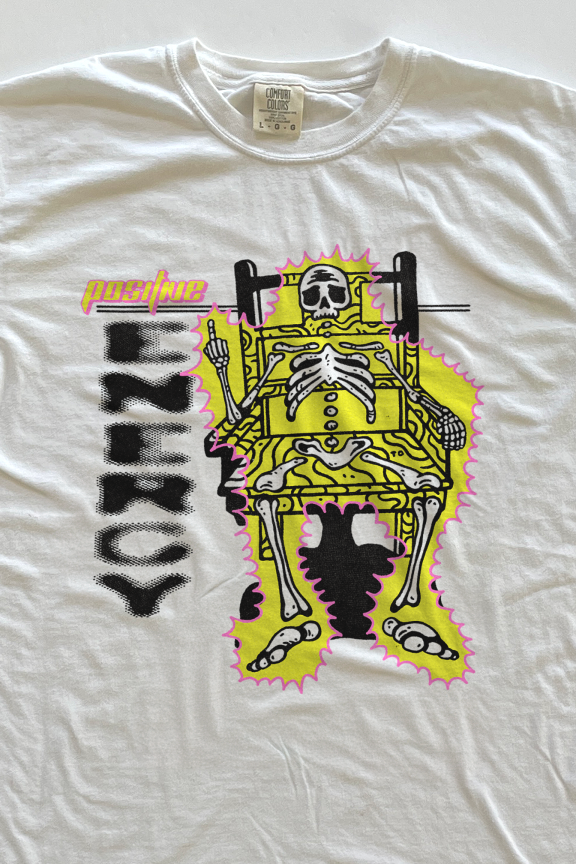 You get what you give. Garment dyed, seamless body crew neck featuring an 'Electric Chair' graphic printed direct to film on the front. Unisex sizing, so a looser women's fit.