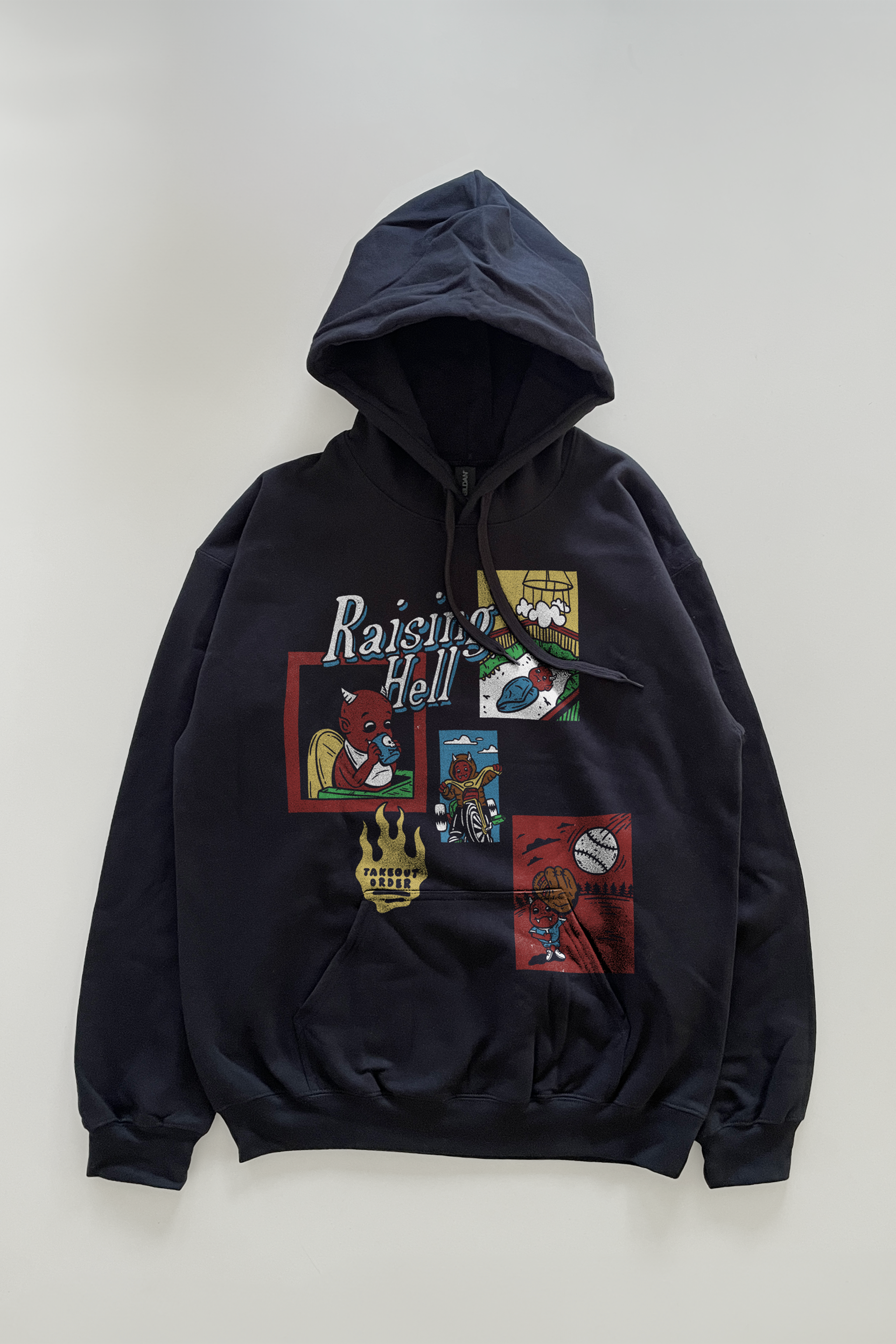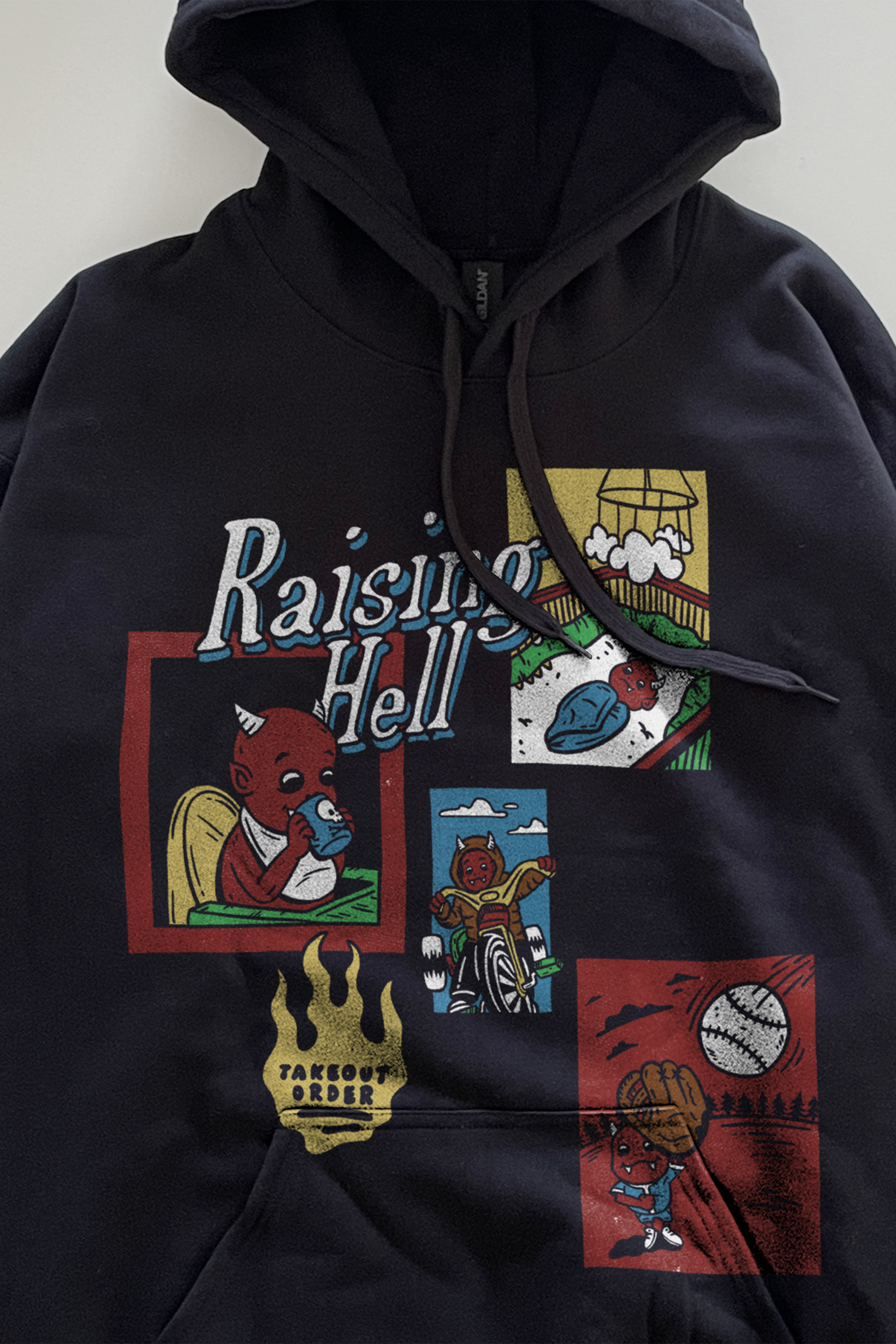 A mid-weight unisex fleece hoodie in black featuring an oversized "Demon Child" print. Fit runs on the smaller side, size up for an oversized look.