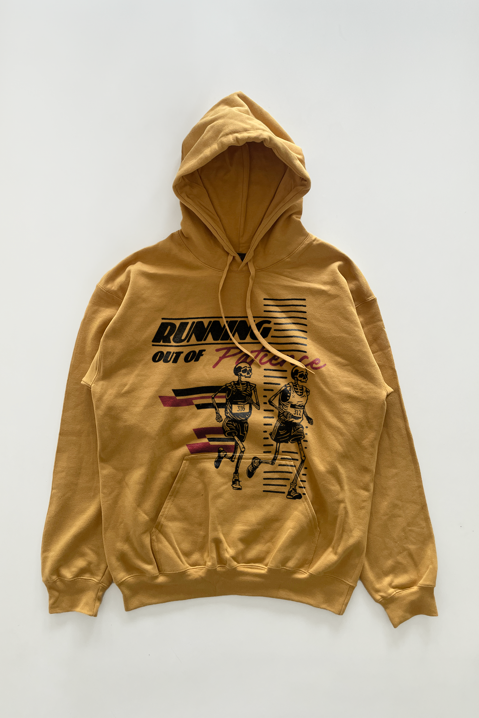 A mid-weight unisex fleece hoodie in mustard featuring an oversized "Runner" print. Fit runs on the smaller side, size up for an oversized look.
