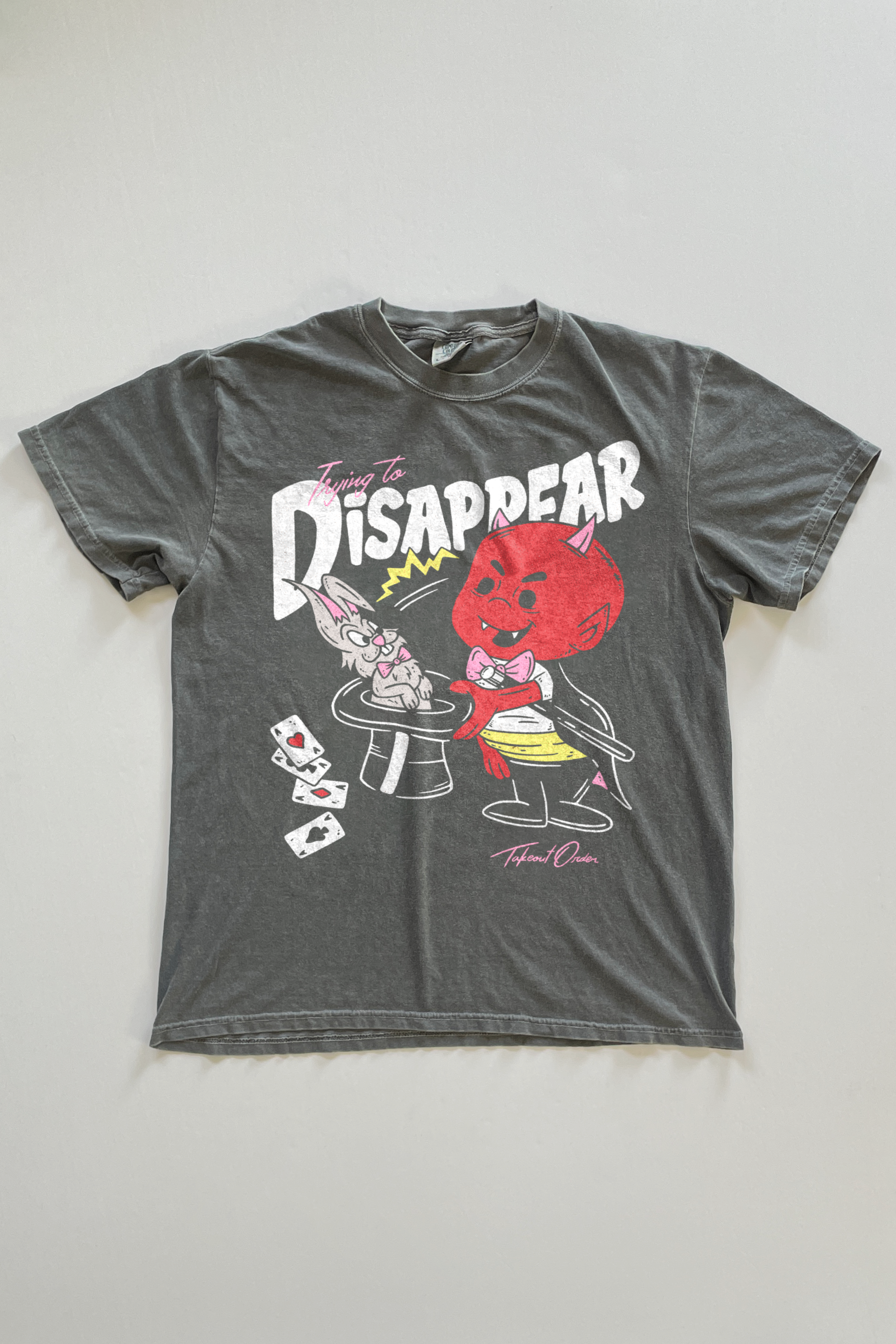 Abracadabra! Garment dyed, seamless body featuring a 'Magician' graphic printed direct to film on the front on a faded black crew neck. Unisex sizing, so a looser women's fit.