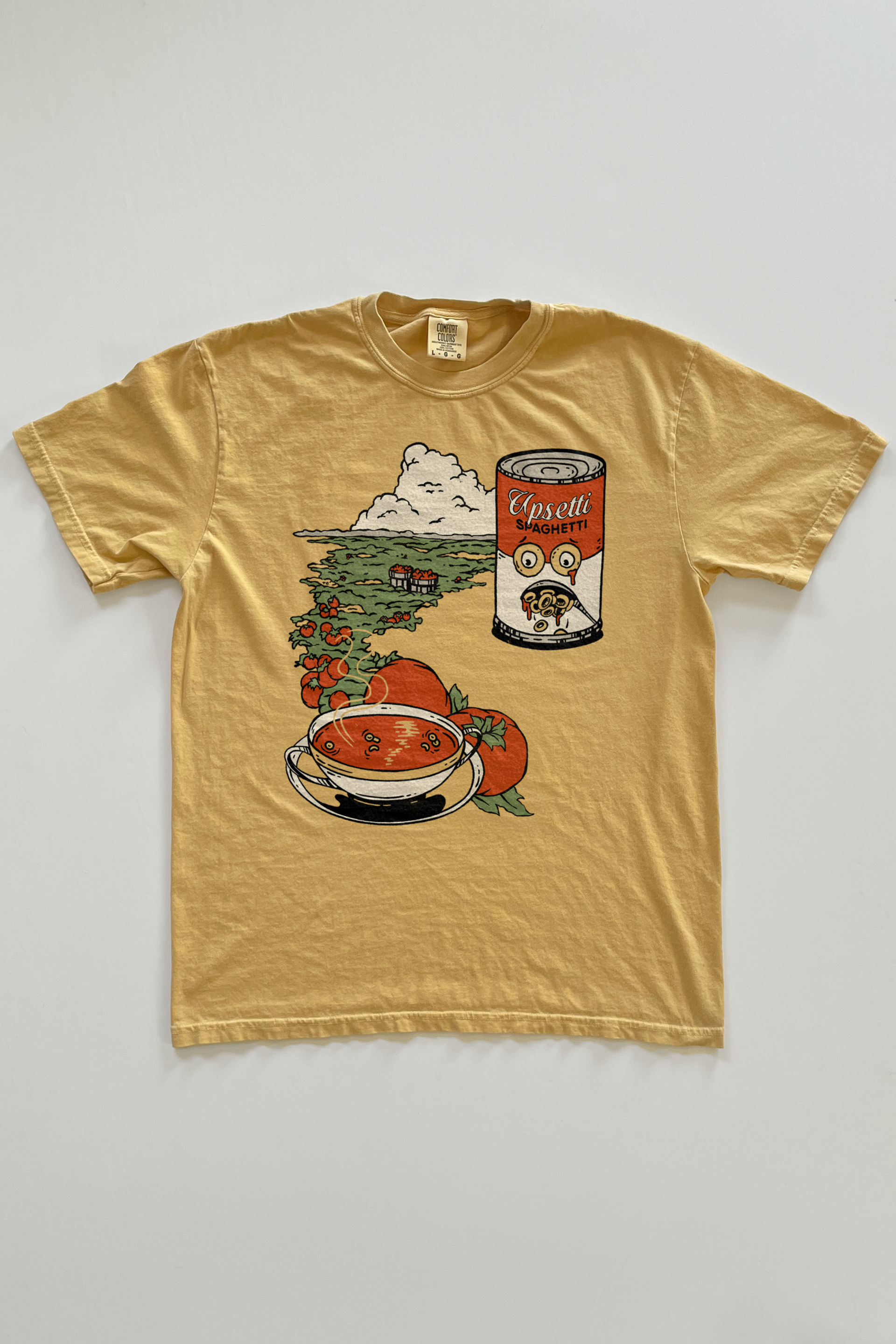 Pairs well with a depresso espresso. Garment dyed, seamless body crew neck featuring a 'Spaghettio and Tomato' graphic printed direct to film on the front. Unisex sizing, so a looser women's fit.